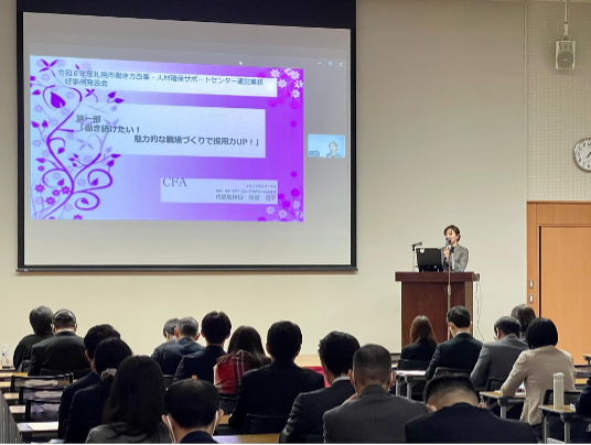 採用コンサルティングでは採用戦略の策定、求人票の添削・サポートや面接の同席など、採用をトータルでサポートしています。離職防止の一環で従業員の方にキャリアコンサルティング面談を実施したり、企業研修では新入社員研修から管理職研修まで、企業の課題に応じ、カスタマイズした研修を行います。月に数回、商工会議所での相談窓口業務や札幌市や北海道のセミナー登壇、専門家派遣にて人事面でお困りの企業さんに訪問をしたりもしています。時には補助金や助成金のアドバイスをさせていただくこともあります。